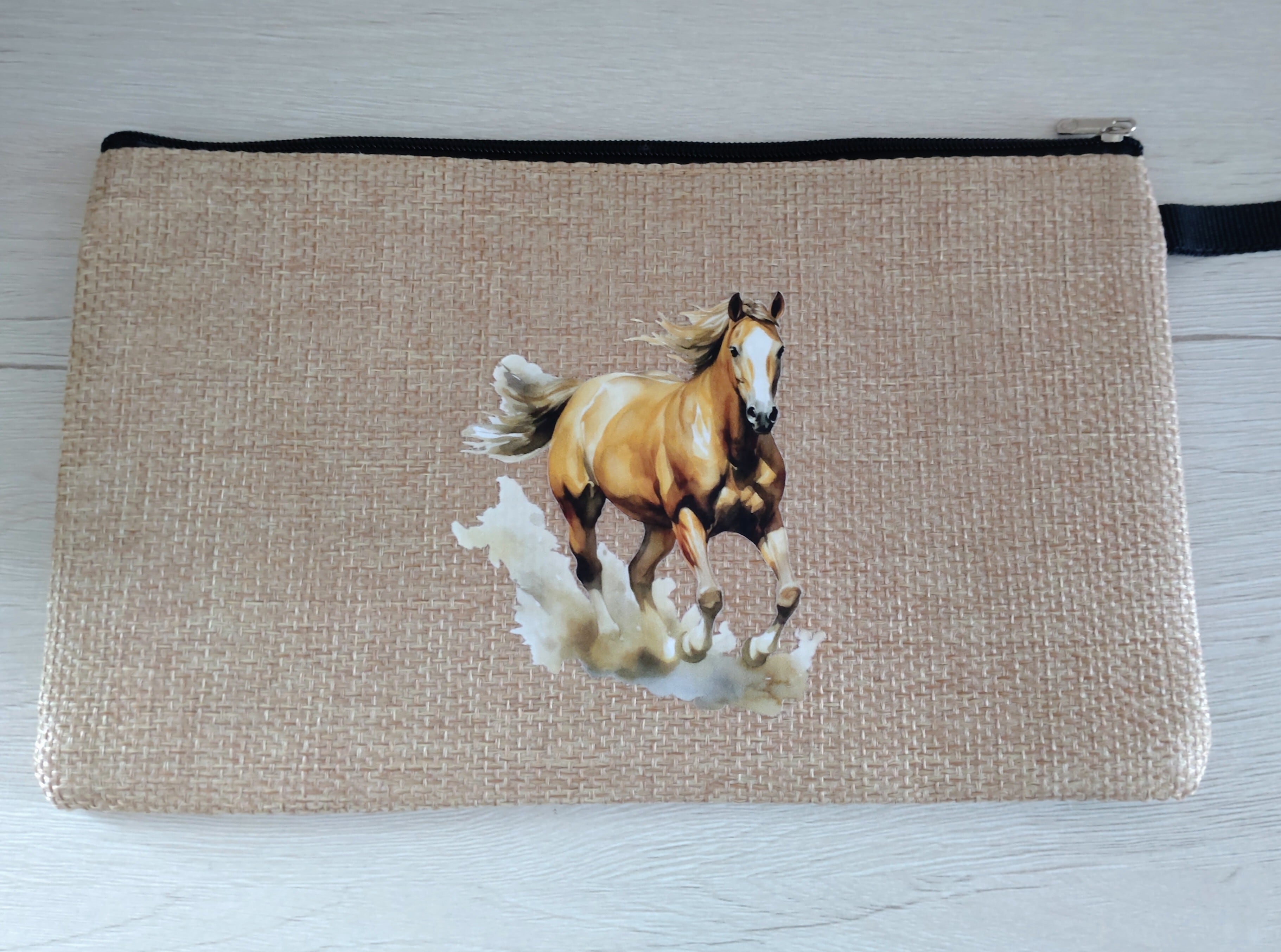 ファスナー式なので、収納物を安全に保管でき、デザイン性だけでなく機能性も兼ね備えています。化粧品や小物類をすっきりと整理できるこの馬柄ポーチは、あなたの毎日をちょっとおしゃれに彩ります。