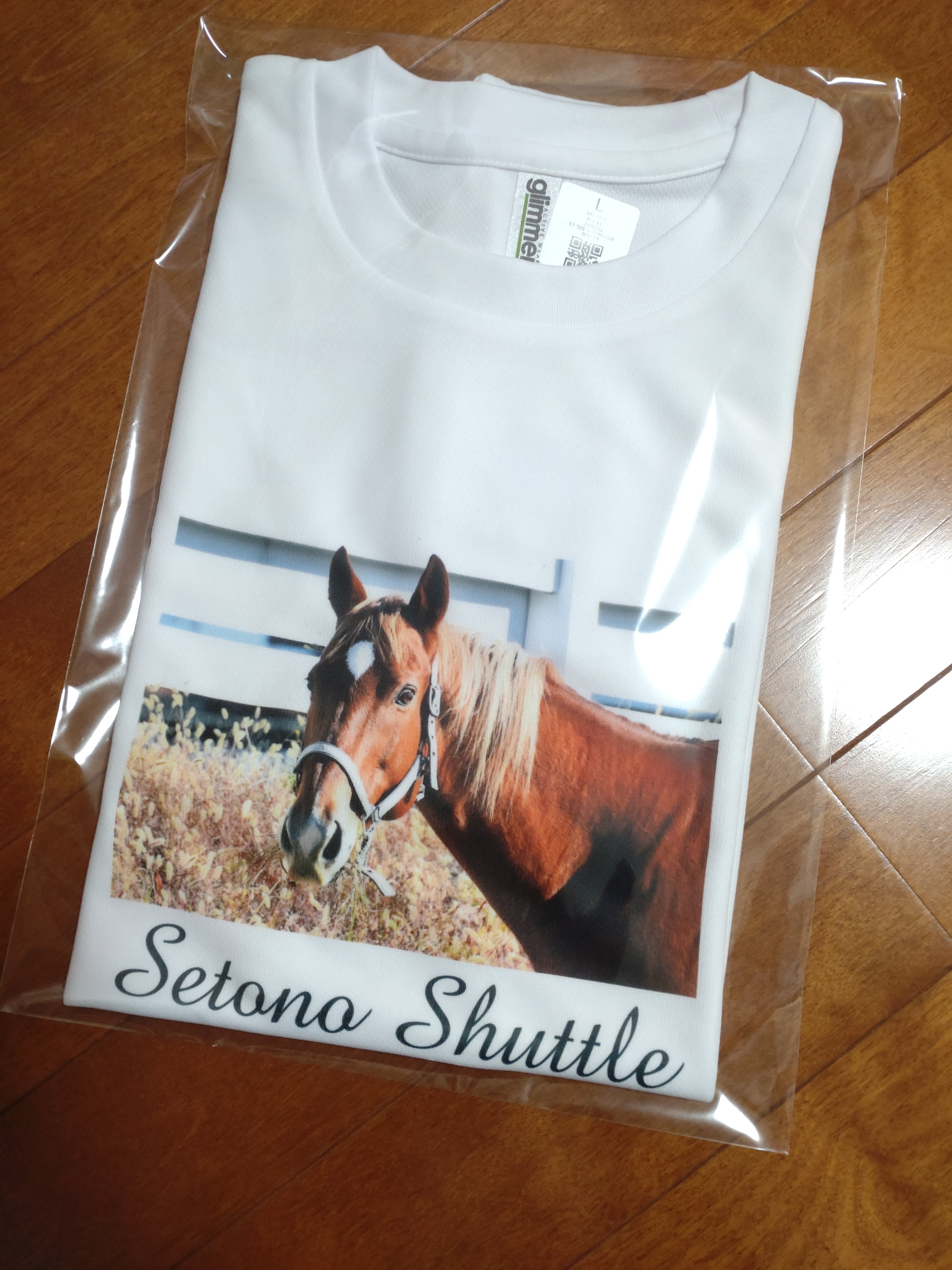 元誘導馬で現在は鈴鹿ホースパーク様で活躍する、セトノシャトルの写真をプリントしたTシャツです。